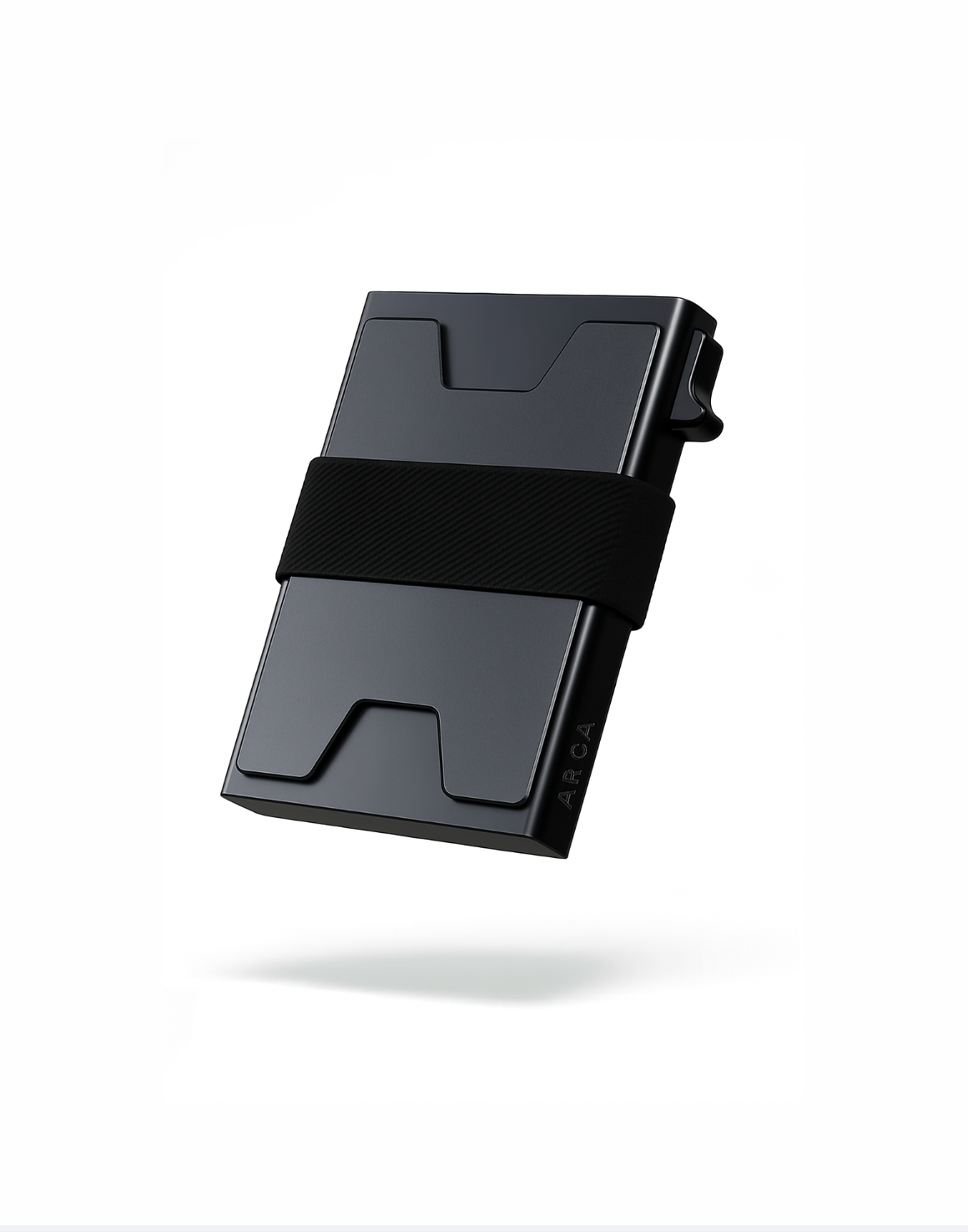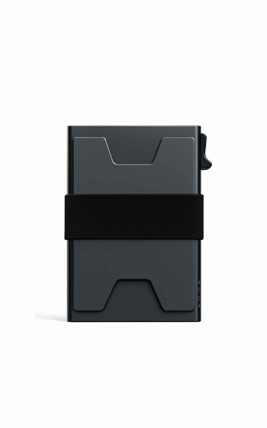 A refined, minimalist card holder featuring a matte black aluminium finish, elastic retention band, designed for secure, compact, and professional everyday carry.