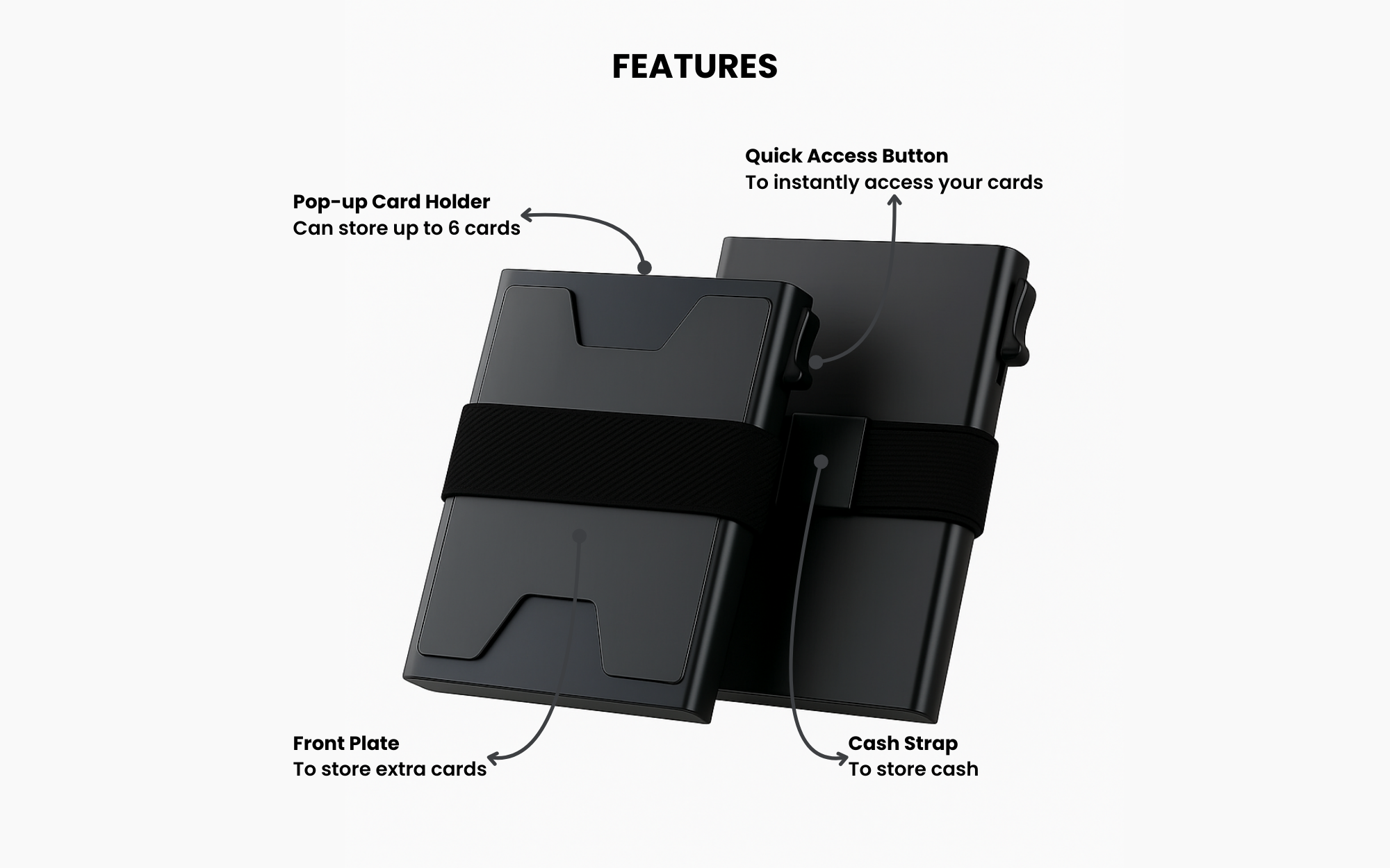 Crafted for elegance, built to endure. Our premium pop-up wallet combines a refined finish with seamless one-click access. Constructed from durable lightweight aluminum and equipped with RFID blocking, it offers both style and security.