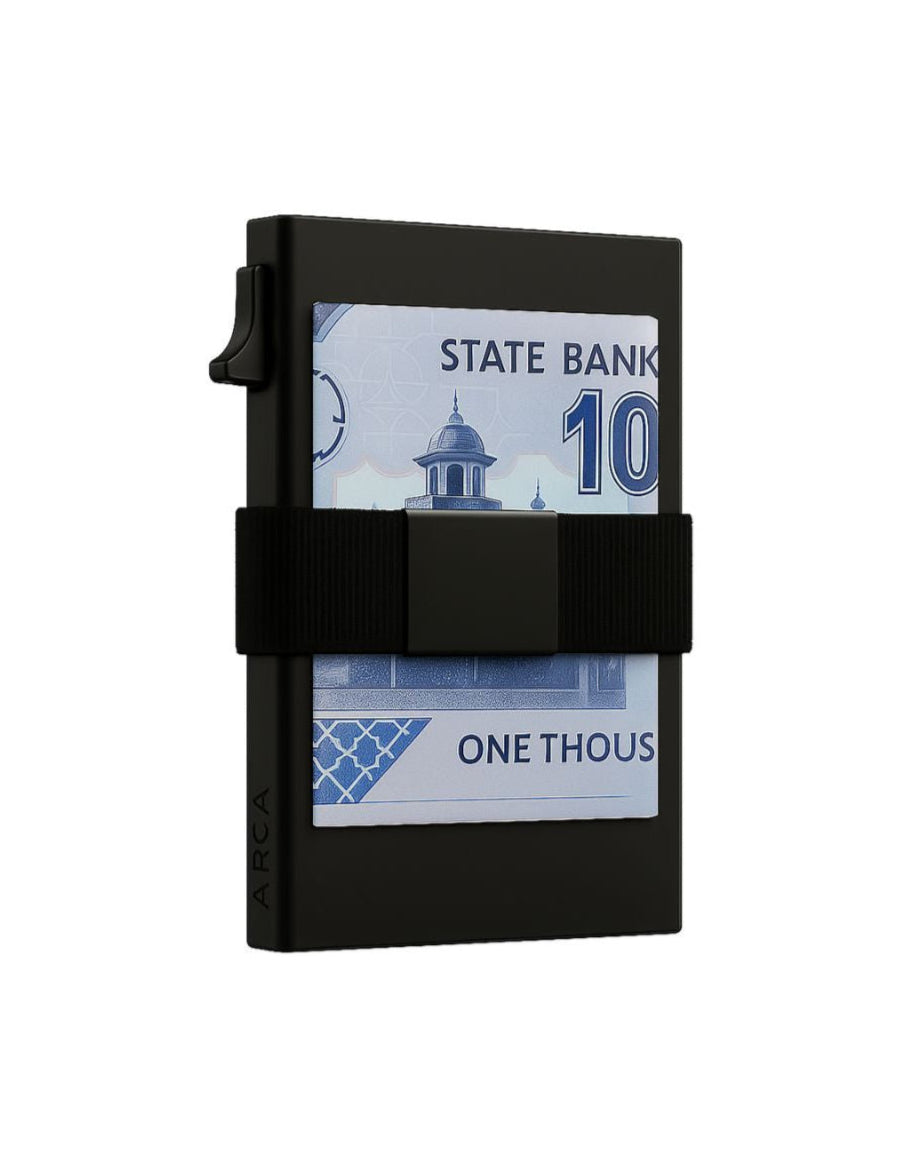 Specifications: Durable aluminium build, RFID blocking protection, Holds up to 6 cards, Extra cards storage in metal plate, Integrated cash strap